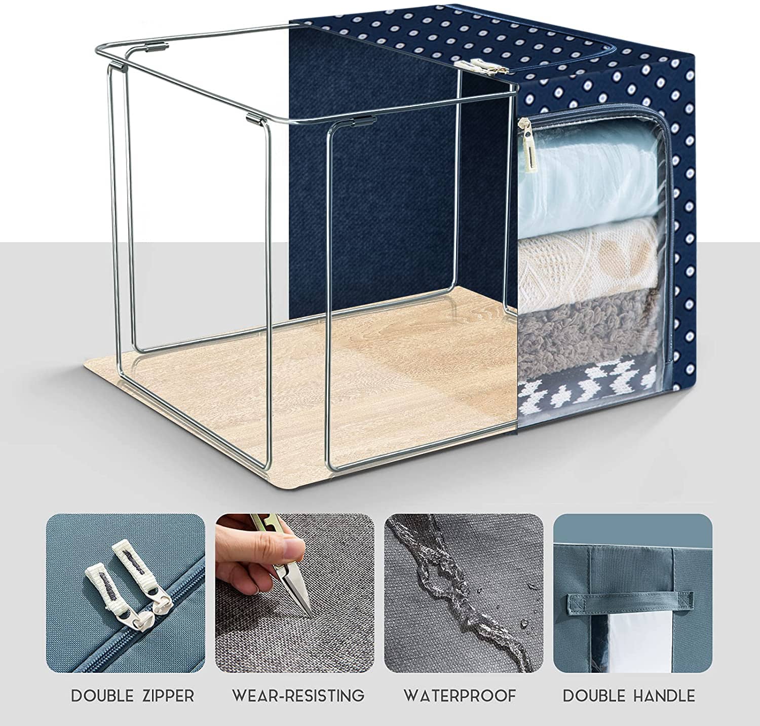 East to Stack: The sturdy steel frame keeps the box firm, making it stackable. The front zipper lets you store things without lifting the box above it.